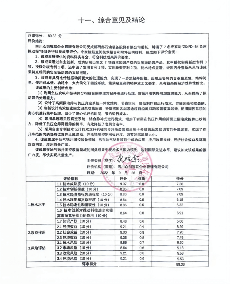 近期,來自西南石油大學(xué)、四川大學(xué)、電子科技大學(xué)、西南交通大學(xué)、四川機械研究設(shè)計院和科研院所的 7 位行業(yè)專家教授,對我公司 “ZS/FD-5K 負壓振動篩” 項目進行了科技成果評價,專家組經(jīng)查閱技術(shù)報告和附件證明材料,一致認為:
